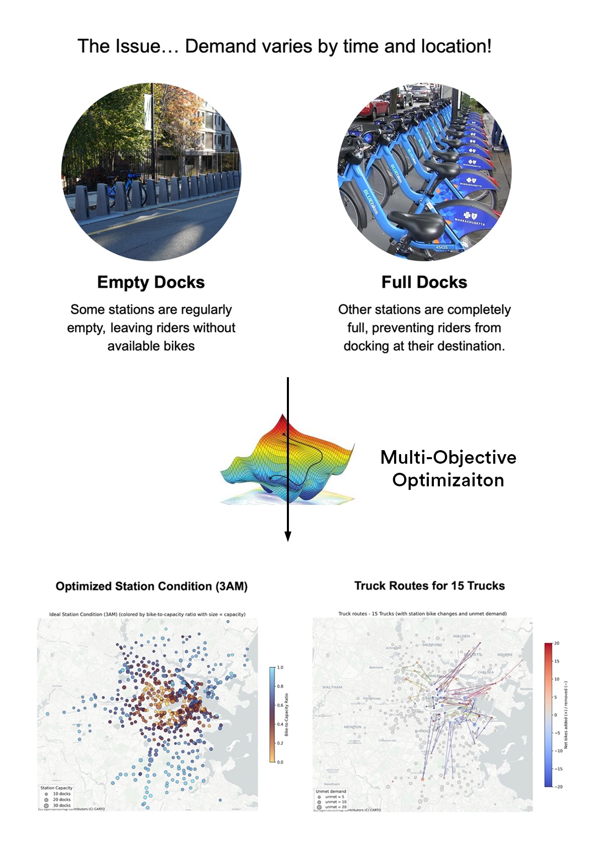 This project develops a predictive rebalancing strategy for the Bluebikes system in Greater Boston, which supports over 27 million trips across 600 stations and 5,500 bikes. Due to highly stochastic and spatially uneven demand, stations frequently become either empty or full, leading to user dissatisfaction and lost ridership. To address this, we formulate a two-stage optimization framework that determines optimal initial bike allocations and truck routing plans before daily operations begin. By leveraging historical demand data, the model minimizes unmet demand and rebalancing costs, providing a data-driven baseline schedule that improves system reliability while reducing operational inefficiencies.