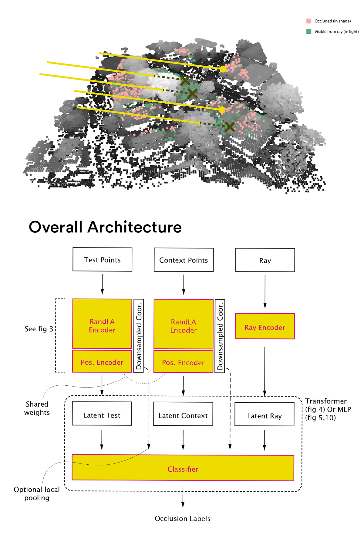 Step 3 - Incorporating Local Geometric Bias To address the model’s difficulty in capturing fine-grained geometric patterns, we introduce a local pooling branch inspired by PointNet++. In addition to global pooling, each test point aggregates features from its K nearest context neighbors using relative positional encoding and shared MLPs, producing a local descriptor that is combined with global and point-wise features for prediction. This local geometric bias significantly improves performance with minimal increase in parameters and no additional inference cost. Qualitative results show sharper probability maps and better recovery of small occluded regions, confirming that explicitly modeling local structure substantially enhances fine-detail prediction.