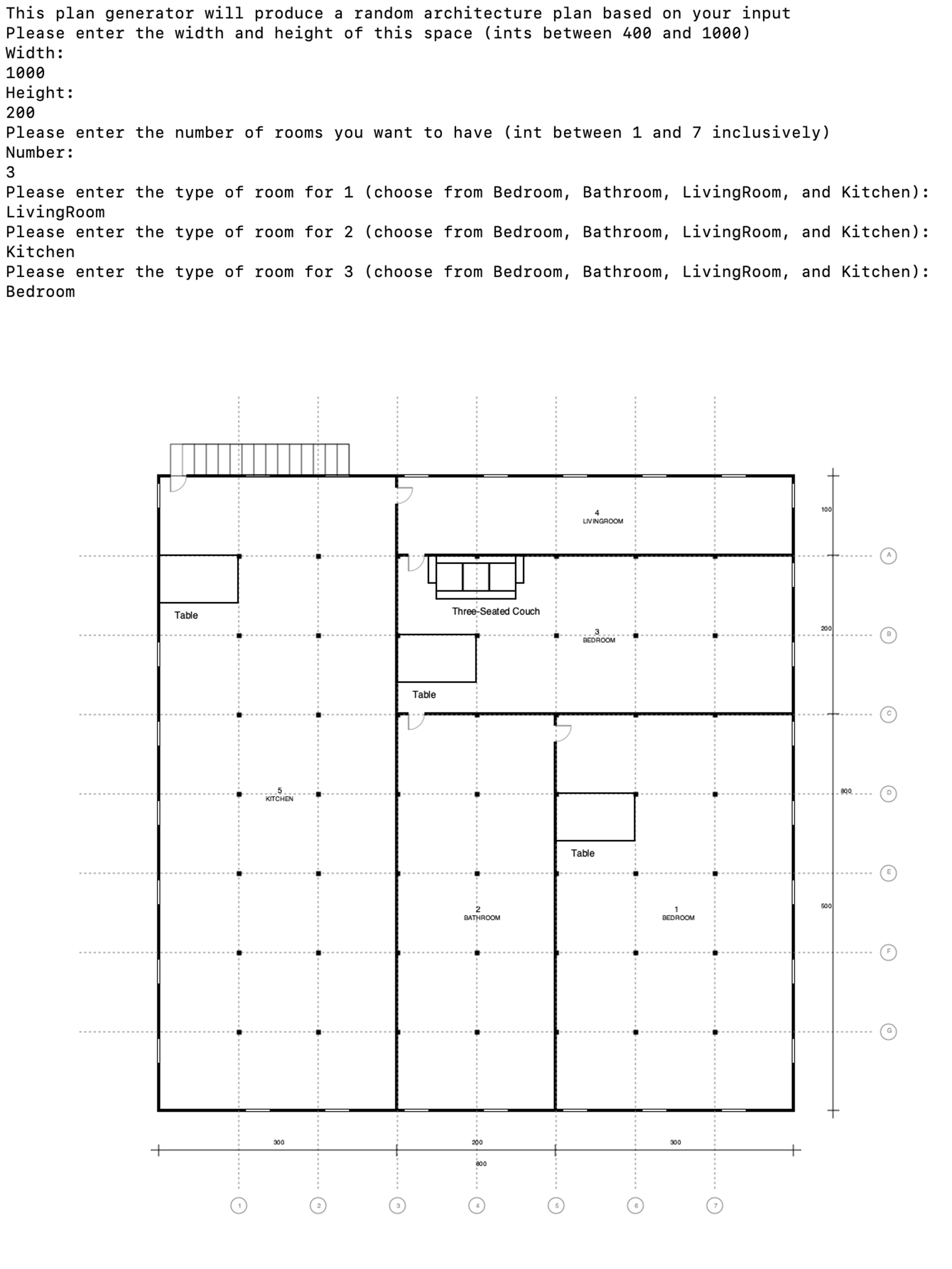 The Plan Generator is an interactive tool developed entirely in the functional programming language OCaml. It is designed to generate randomized layouts based on user-defined parameters. By accepting inputs such as the dimensions of a space (width and height), the number of rooms, and their specific types, the program produces multiple layout options that adhere to the provided criteria.